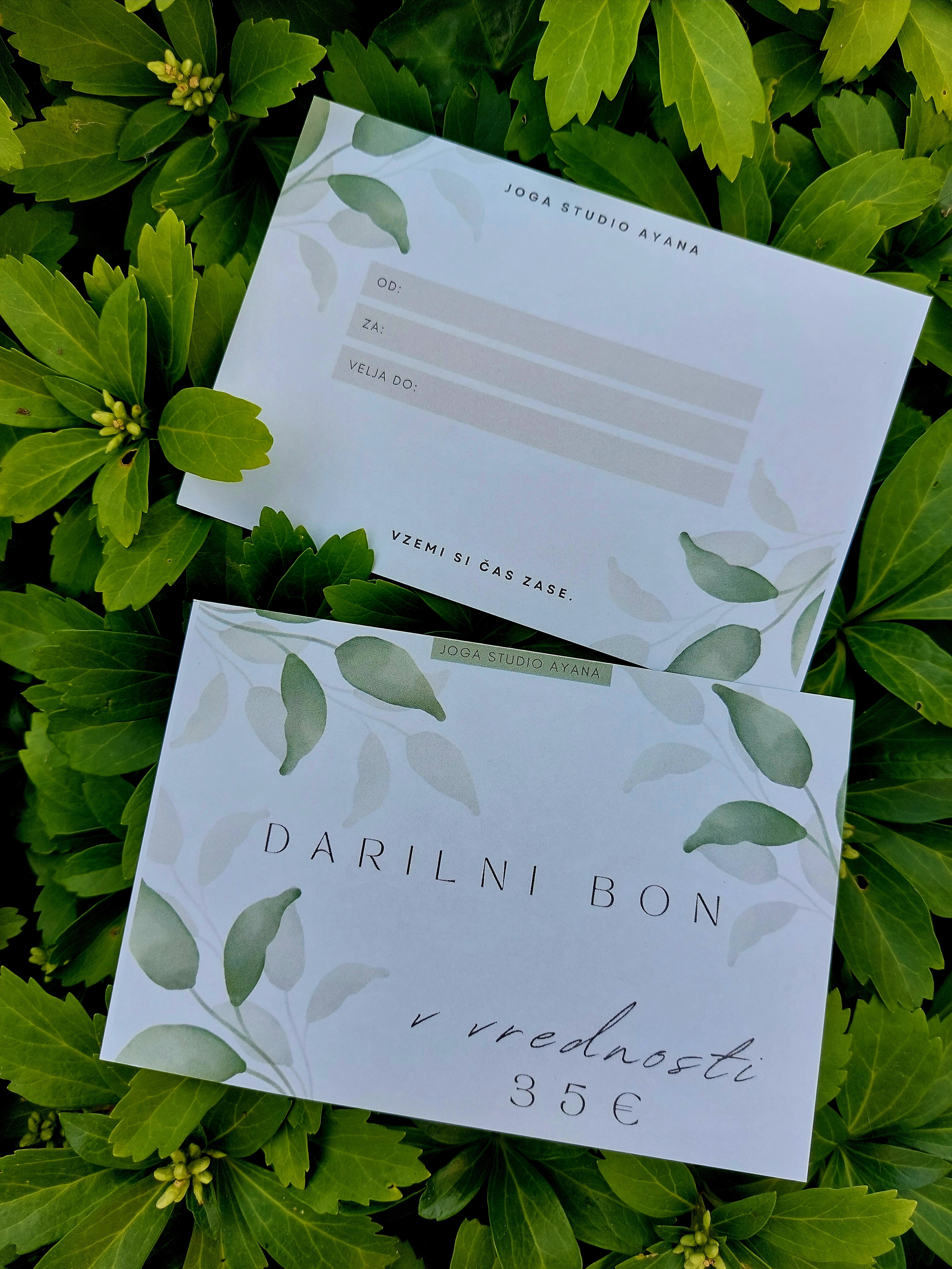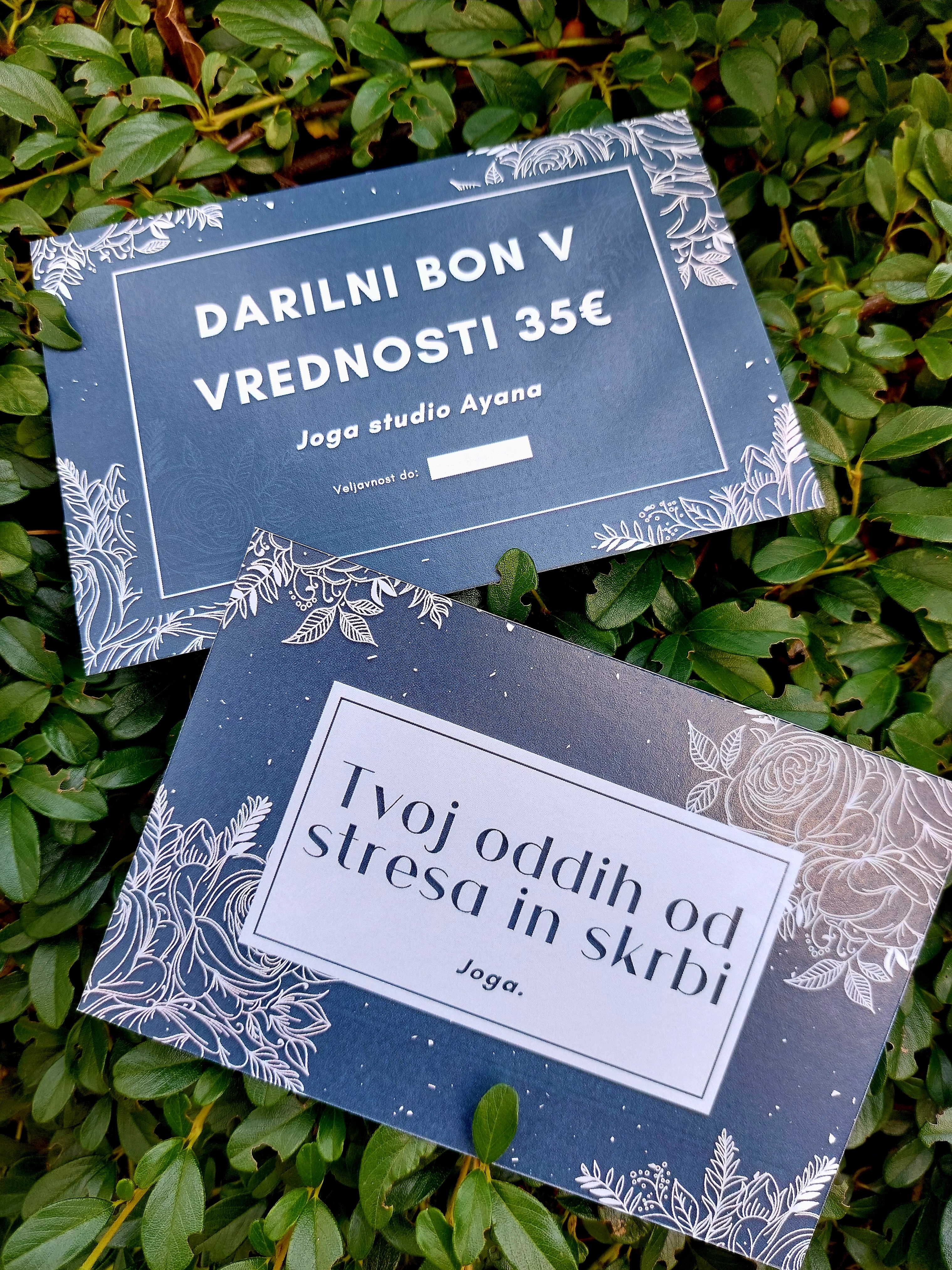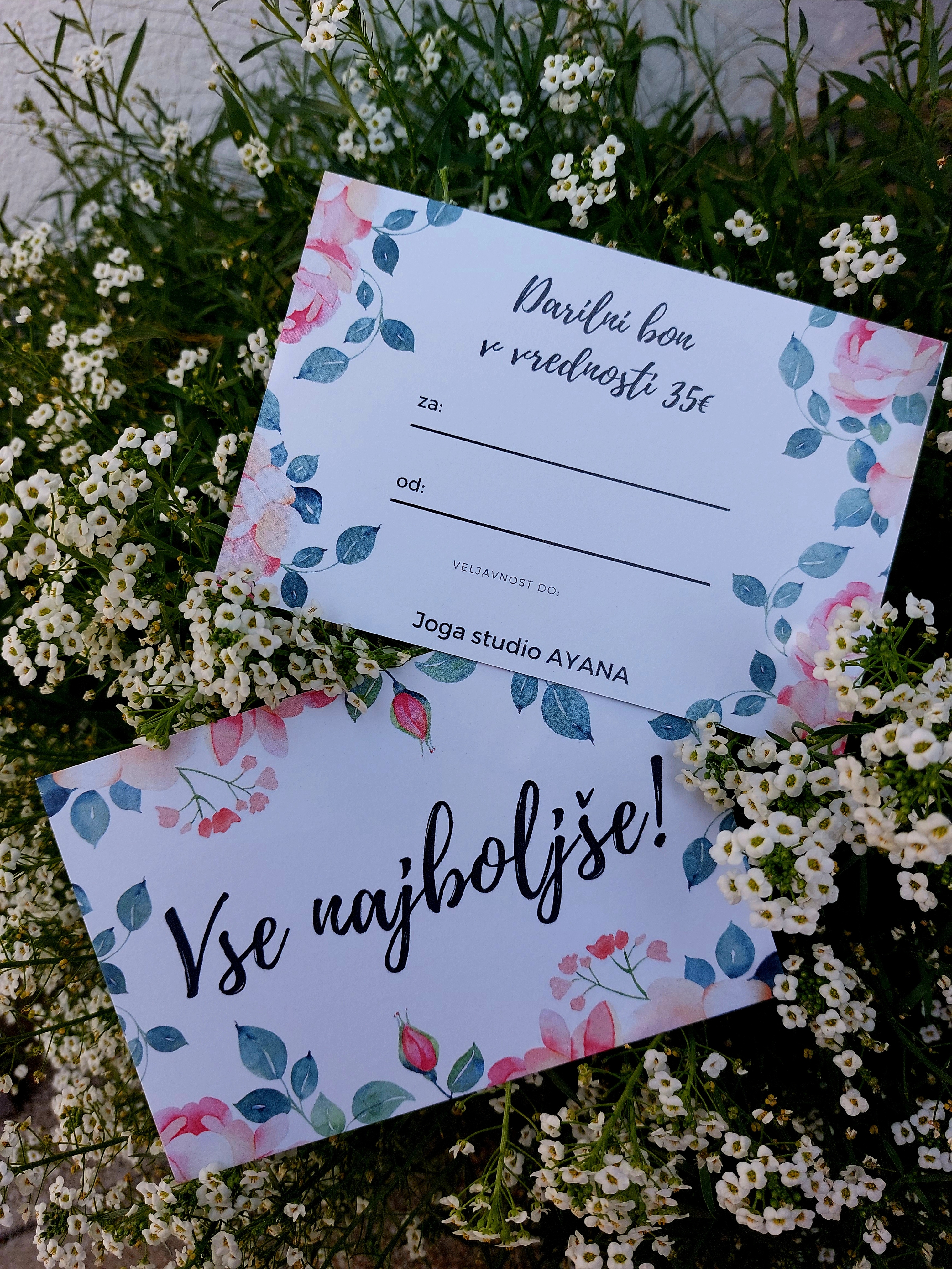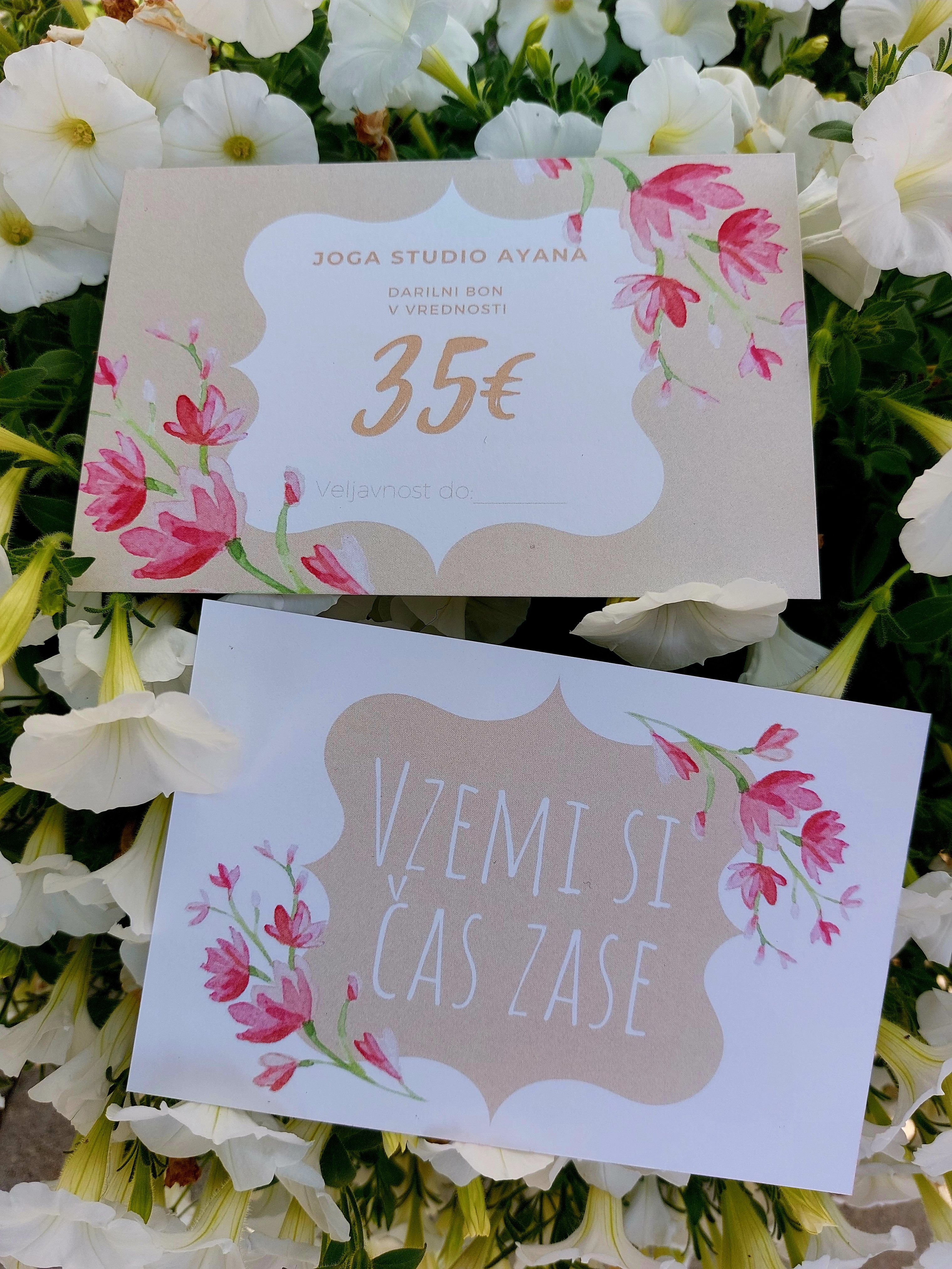 Svoje bližnje lahko obdarite s čudovitim bonom za vadbo joge v višini 35€ (mesečna vadnina za obisk joge 1-krat tedensko), ali v višini 53€ (mesečna vadnina za obisk joge 2-krat tedensko), izbirate pa lahko med štirimi različnimi motivi.